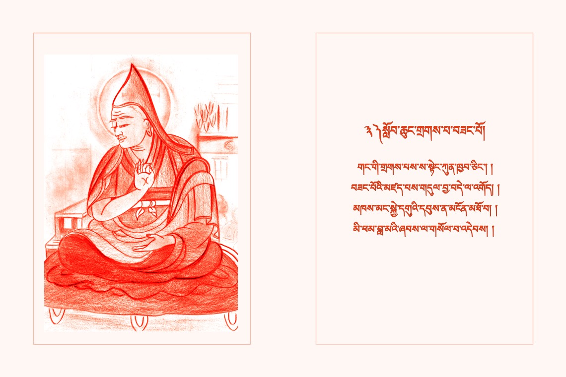 མཁས་མང་སྐྱེ་དགུའི་དབུས་ན་མངོན་མཐོ་བ། །མི་ཕམ་བླ་མའི་ཞབས་ལ་གསོལ་བ་འདེབས། །