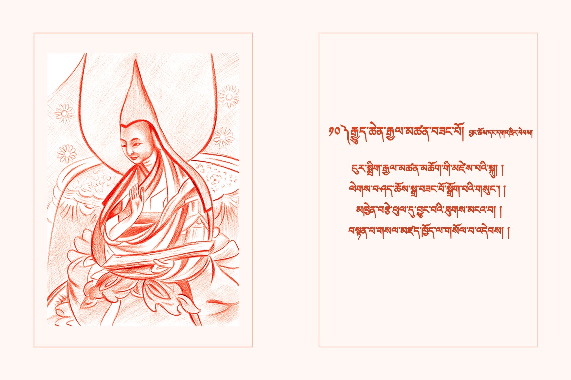 སྐལ་བཟང་གདུལ་བྱའི་པད་ཚལ་གཉེན་གཅིག་པུ། །རྨད་བྱུང་བཤེས་གཉེན་ཞབས་ལ་གསོལ་བ་འདེབས། །
