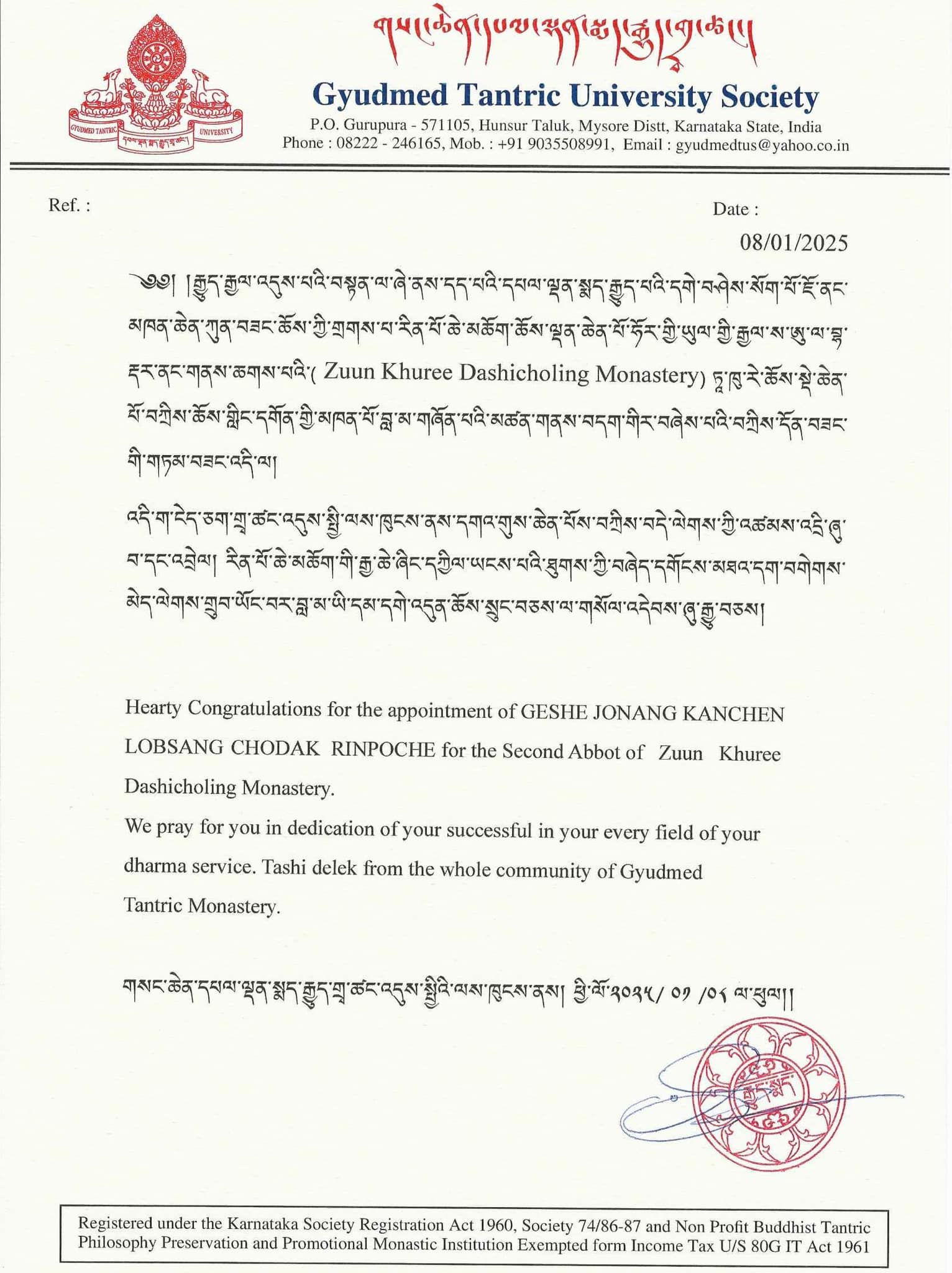( Zuun Khuree Dashicholing monastery ) ཏཱ་ཁུ་རེ་ཆོས་སྡེ་ཆེན་པོ་བཀྲིས་ཆོས་གླིང་དགོན་གྱི་མཁན་པོ་བླ་མ་གཞོན་པའི་མཚན་གནས་བདག་གིར་བཞེས་པའི་བཀྲིས་དོན་བཟང་གི་གཏམ་བཟང་འདི་ལ། འདི་ག་ངེད་ཅག་གྲྭ་ཚང་འདུས་སྤྱི་ལས་ཁུངས་ནས་དགའ་གུས་ཆེན་པོས་བཀྲིས་བདེ་ལེགས་ཀྱི་འཚམས་འདི་ཞུ་བ་དང་འབྲེལ། རིན་པོ་ཆེ་མཆོག་གི་རྒྱ་ཆེ་ཞིང་དཀྱེལ་ཡངས་པའི་ཐུགས་ཀྱི་བཞེད་དགོངས་མཐའ་དག་བགེགས་མེད་ལེགས་གྲུབ་ཡོང་བར་བླ་མ་ཡི་དམ་དགེ་འདུན་ཆོས་སྲུང་བཅས་ལ་གསོལ་འདེབས་ཞུ་རྒྱུ་བཅས། གསང་ཆེན་དཔལ་ལྡན་སྨད་རྒྱུད་གྲྭ་ཚང་འདུས་སྤྱིའི་ལས་ཁུངས་ནས། སྤྱི་ལོོ་ ༢༠༢༥ ཟླ་ ༠༡ ཚེས་ ༠༨ ཉིན། རྒྱུད་སྨད་དཔེ་མཛོད་ཁང་དྲ་ངོས་རྩོམ་སྒྲིག་པས་ ༢༠༢༥།༠༡།༠༨།ལ།