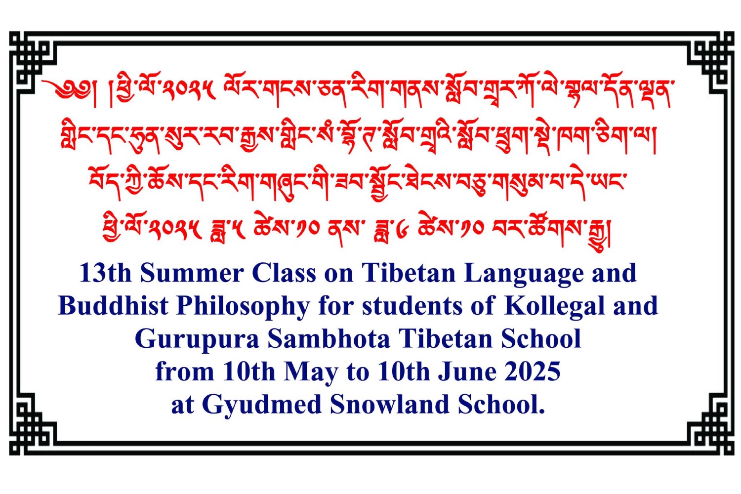 ༄༅། །འཕགས་ཡུལ་ལྷོ་ཕྱོགས་དཔལ་ལྡན་སྨད་རྒྱུད་གྲྭ་ཚང་གི་གངས་ཅན་རིག་གནས་སློབ་གྲྭ་རུ། སྤྱི་ལོ་ ༢༠༢༥ ཟླ་ ༥ ཚེས་༡༠ ཉིན་ཀོ་ལེ་གྷལ་དོན་ལྡན་གླིང་དང་། ཧུན་སུར་རབ་རྒྱས་གླིང་། སཾ་བྷོ་ཊ་སློབ་གྲྭ་ཁག་གཉིས་ཀྱི་སློབ་ཕྲུག་སྡེ་ཁག་གཅིག་ལ།