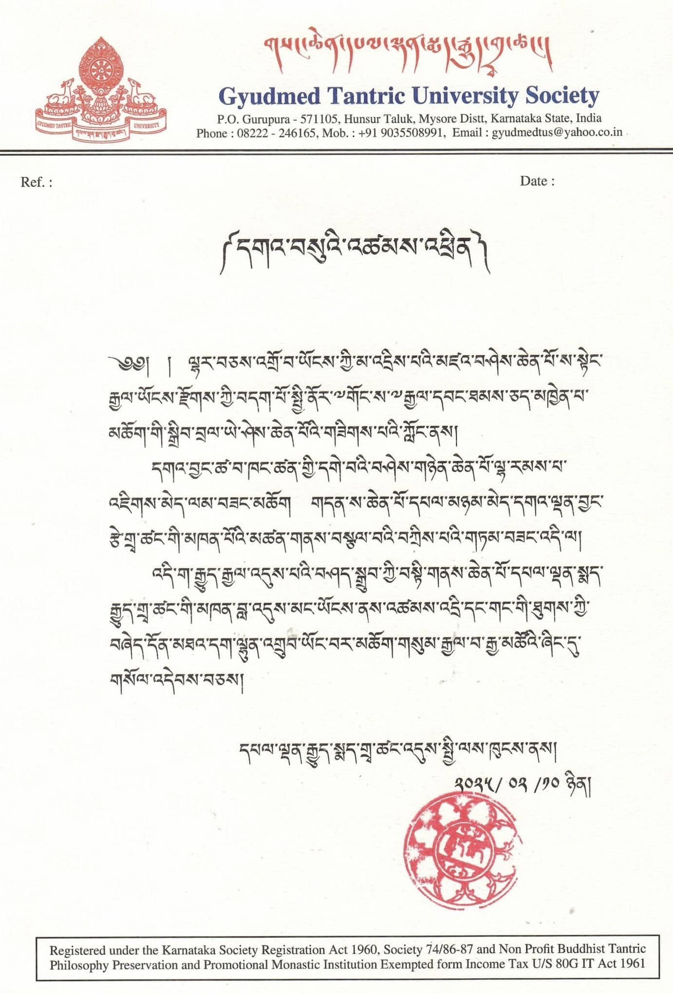 དགའ་བྱང་ཚ་བ་ཁང་ཚན་གྱི་དགེ་བའི་བཤེས་གཉེན་ཆེན་པོ་ལྷ་རམས་པ་འཇིགས་མེད་ལམ་བཟང་མཆོག །གདན་ས་ཆེན་པོ་དཔལ་མཉམ་མེད་དགའ་ལྡན་བྱང་རྩེ་གྲྭ་ཚང་གི་མཁན་པོའི་མཚན་གནས་སྩལ་བའི་བཀྲིས་པའི་གཏམ་བཟང་འདི་ལ། འདི་ག་རྒྱུད་རྒྱལ་འདུས་པའི་བཤད་སྒྲུབ་ཀྱི་བསྟི་གནས་ཆེན་པོ་དཔལ་ལྡན་སྨད་རྒྱུད་གྲྭ་ཚང་གི་མཁན་བླ་འདུས་མང་ཡོངས་ནས་འཚམས་འདྲི་དང་གང་གི་ཐུགས་ཀྱི་བཞེད་དོན་མཐའ་དག་ལྷུན་འགྲུབ་ཡོང་བར་མཆོག་གསུམ་རྒྱལ་བ་རྒྱ་མཚོའི་ཞིང་དུ་གསོལ་འདེབས་བཅས། དཔལ་ལྡན་རྒྱུད་སྨད་གྲྭ་ཚང་འདུས་སྤྱིའི་ལས་ཁུངས་ནས། ༢༠༢༥།༠༢།༡༠ ཉིན། རྒྱུད་སྨད་དཔེ་མཛོད་ཁང་དྲ་ངོས་རྩོམ་སྒྲིག་པས་ ༢༠༢༥།༠༢།༡༠།ལ།
