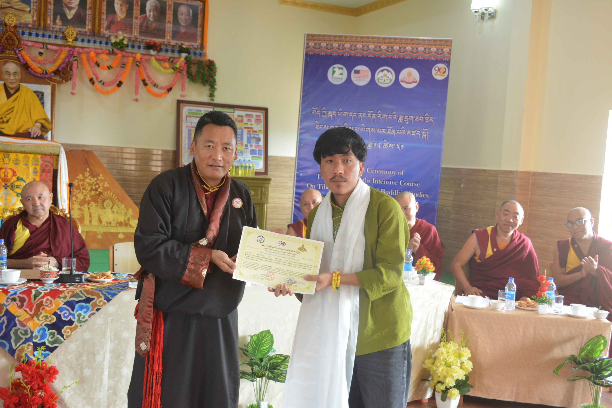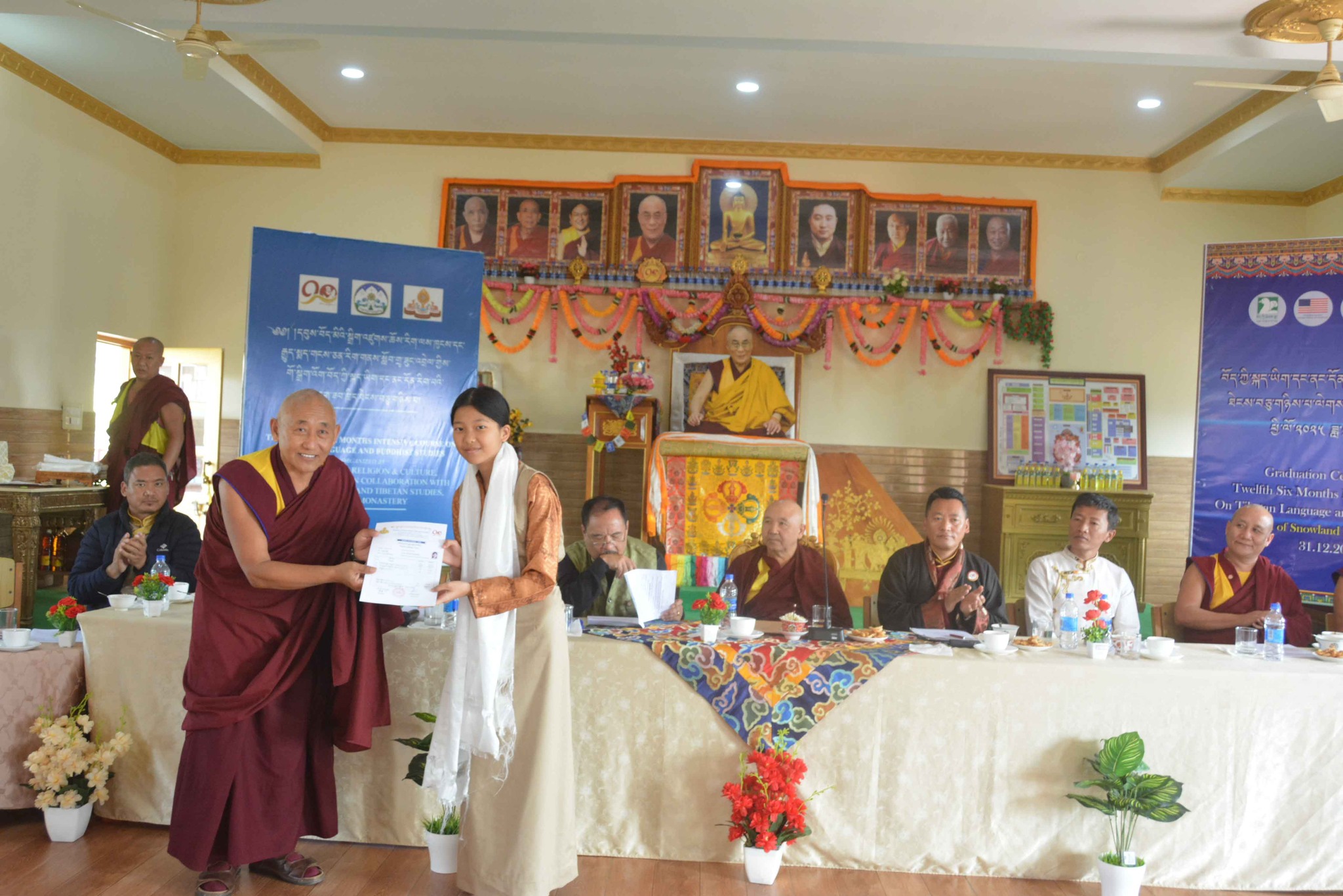 སྐུ་མགྲོན་གཙོ་བོ་མཆོག་ནས་རྒྱུགས་སྤྲོད་རྩེ་ཕུད་གསུམ་དང་། དེ་བཞིན་བོད་མི་མང་སྤྱི་འཐུས་མི་འགྱུར་རྡོ་རྗེ་ལགས་ནས་ཉེ་བའི་རྩེ་ཕུད་གསུམ་ལ་བྱ་དགའ་གནང་ཡོད། དེ་ནས་རིམ་པས་ཆོས་རིག་དྲུང་ཆེ་ནས་ཟབ་ཁྲིད་མཐར་སོན་གྱི་ཕྱག་འཁྱེར་དང་། ཧོན་སུར་ས་གནས་འགོ་འཛིན་ནས་ཡིག་རྒྱུགས་གྲུབ་འབྲས་ཀྱི་ཨང་ཤོག་གནང་རྗེས་ཆོས་རིག་དྲུང་ཆེ་ནས་ཆོས་རིག་ལས་ཁུངས་ངོས་ནས་རྒྱུད་སྨད་གངས་ཅན་རིག་གནས་སློབ་གྲྭའི་དགེ་ལས་རྣམ་པར་ཐུགས་རྗེ་ལེགས་གསོལ་གྱི་ཕྱག་རྟགས་ཕུལ་ཡོད། དེ་ནས་དཔལ་ལྡན་སྨད་རྒྱུད་གྲྭ་ཚང་གི་སློབ་སྤྱི་དགེ་བཤེས་སྔགས་རམས་པ་རྒན་བསོད་ནམས་དངོས་གྲུབ་ལགས་ཀྱིས་སློབ་ཕྲུག་ཡོངས་ལ་སྟོང་མིན་ཙམ་གྱི་ཕྱག་རྟགས་རེ་དང་། སློབ་ཕྲུག་བུའི་རྒན་བདག་ཟླ་བ་བསྟན་འཛིན་ལགས་དང་། བུ་མོའི་རྒན་བདག་བསྟན་འཛིན་སྒྲོལ་མ་གཉིས་ལ་ཐུགས་རྗེ་ལེགས་གསོལ་གནང་།