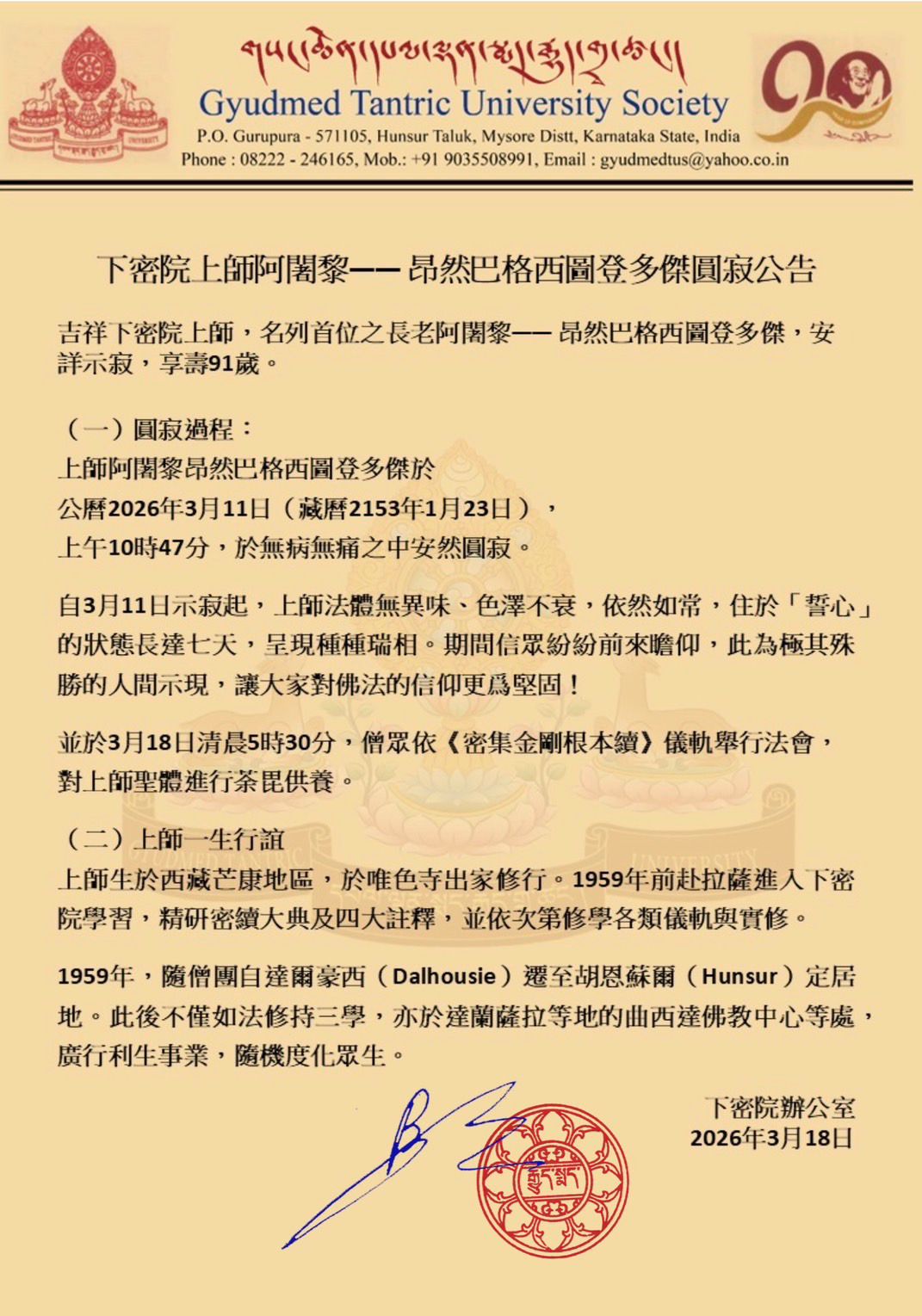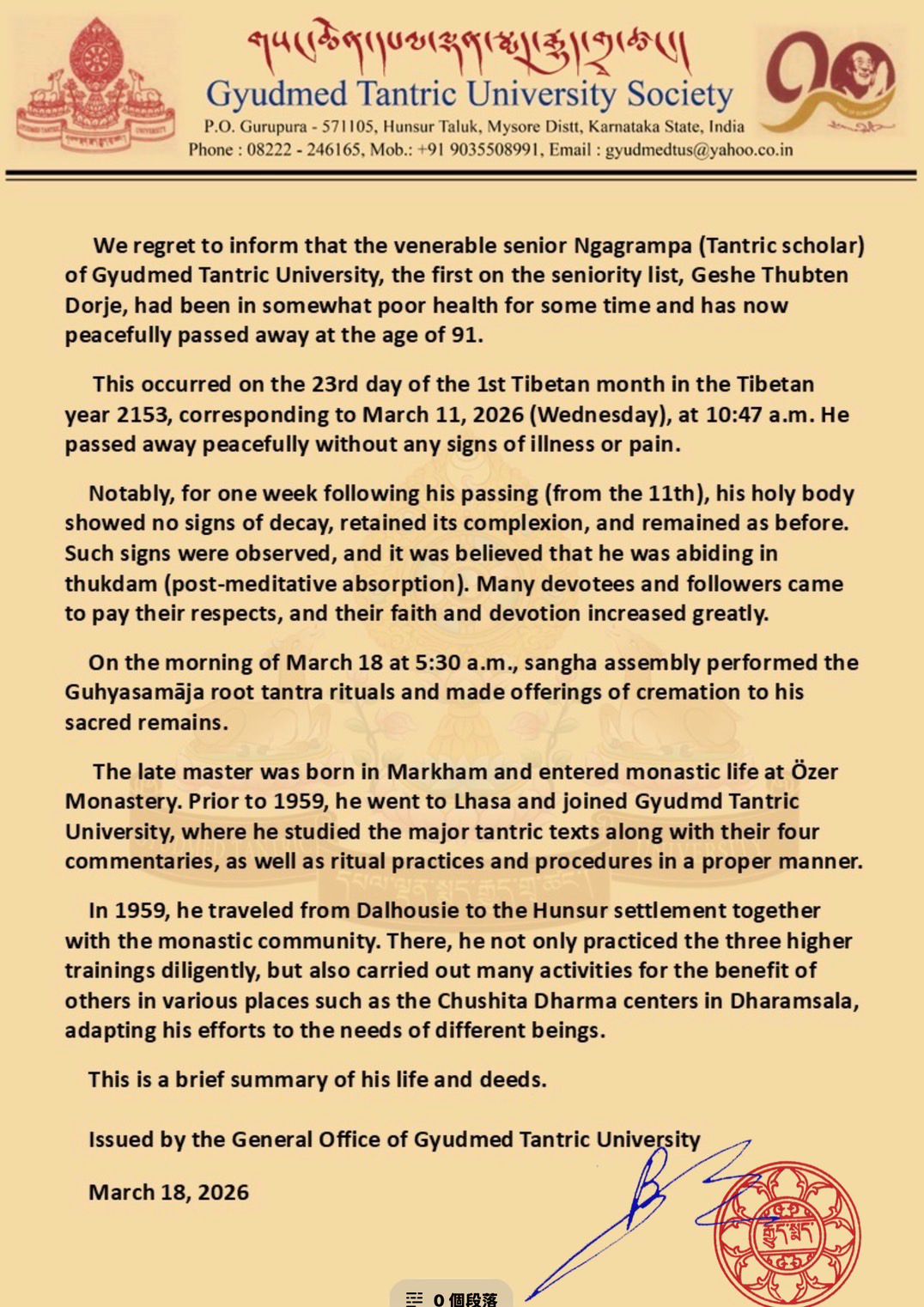 གནས་ཚུལ་བྱུང་སོང། དེ་ཡང་བོད་རྒྱལ་ལོ་ ༢༡༥༣ བོད་ཟླ་ ༠༡ ཚེས་ ༢༣ དང་སྤྱི་ལོ་ ༢༠༢༦ སྤྱི་ཟླ་ ༠༣ ཚེས་ ༡༡ རེས་གཟའ་ལྷག་དཀར་ཉིན་གྱི་སྔ་དྲོའི་ཕྱག་ཚོད་ ༡༠།༤༧ ལ་སྐུའི་བསྙུང་གཟེར་སོགས་གང་ཡང་མེད་པར་ཞི་ལྷོད་ངང་སྐུ་ཞི་བར་གཤེགས། ལྷག་པར་དུ་གོང་ཚེས་ ༡༡ ནས་བདུན་ཕྲག་གཅིག་རིང་སྐུ་ཕུང་ལ་དྲི་མ་མེད་ཅིང་སྐུ་མདངས་མི་ཉམས་པར་སྔར་རྒྱུན་ལྟར་རང་སོར་གནས་པ་སོགས་རྟགས་དང་མཚན་མ་བྱུང་སྟེ། ཐུགས་དམ་ལ་བཞུགས་པར་འབྲེལ་ཡོད་ཀུན་གྱིས་དབང་པོའི་སྤྱོད་ཡུལ་དུ་མཇལ་ཞིང་དད་མོས་ལྷག་པར་འཕེལ་བའི་ཚུལ་བྱུང་། སྤྱི་ཚེས་ ༡༨ འདིའི་སྔ་དྲོ་ཕྱག་ཚོད་ ༥།༣༠ ཐོག་འདུས་མང་གིས་གསང་འདུས་རྩ་རྒྱུད་གསུང་བཞིན་དུ་དམ་པའི་སྐུ་གདུང་རིན་པོ་ཆེ་ཞུགས་འབུལ་ཕུལ། དམ་པ་འདི་འཁྲུངས་ཡུལ་སྨར་ཁམས་དང་འོད་ཟེར་དགོན་པར་ཆོས་ཞུགས་གནང་། སྤྱི་ལོ་ ༥༩ སྔོན་ལ་ལྷ་སར་དཔལ་ལྡན་སྨད་རྒྱུད་གྲྭ་ཚང་དུ་རྒྱུད་ལ་ཞུགས་ཏེ་དམ་ཆོས་འགྲེལ་པ་བཞི་སྦྲགས་ཀྱིས་དབུས་གསང་སྔགས་གཞུང་ཆེན་གསན་བཞེས་དང་། ཆོ་ག་ཕྱག་ལེན་སོགས་ལ་སློབ་གཉེར་ཚུལ་བཞིན་མཛད་མུར། ༥༩ ལོར་ཌལ་ཧོར་ནས་ཧུན་སུར་གཞིས་ཆགས་སུ་འདུས་མང་དང་ལྷན་དུ་ཕེབས་ཏེ་བསླབ་གསུམ་ཉམས་བཞེས་ཚུལ་བཞིན་མཛད་པ་ཙམ་མ་ཟད། རྡ་ས་ཀྲུ་ཤི་ཏ་ཆོས་ཚོགས་སོགས་སུ་དོན་གཉེར་ཅན་དུ་མར་གང་ལ་གང་འདུལ་གྱི་གཞན་ཕན་གྱི་བྱ་བའང་མང་དུ་མཛད་ཡོད་པ་བཅས་ཏེ་སྐབས་འབྲེལ་ཁོང་གི་མཛད་རྣམ་ཤིན་ཏུ་སྙིང་བསྡུས་དང་བཅས། དཔལ་ལྡན་སྨད་རྒྱུད་གྲྭ་ཚང་འདུས་སྤྱིའི་ལས་ཁང་ནས་སྤྱི་ལོ་ ༢༠༢༦ ཟླ་བ་ ༠༣ ཚེས་ ༡༨ ལ། རྒྱུད་སྨད་དཔེ་མཛོད་ཁང་དྲ་ངོས་རྩོམ་སྒྲིག་པས་ ༢༠༢༦།༠༣།༡༩།ལ།