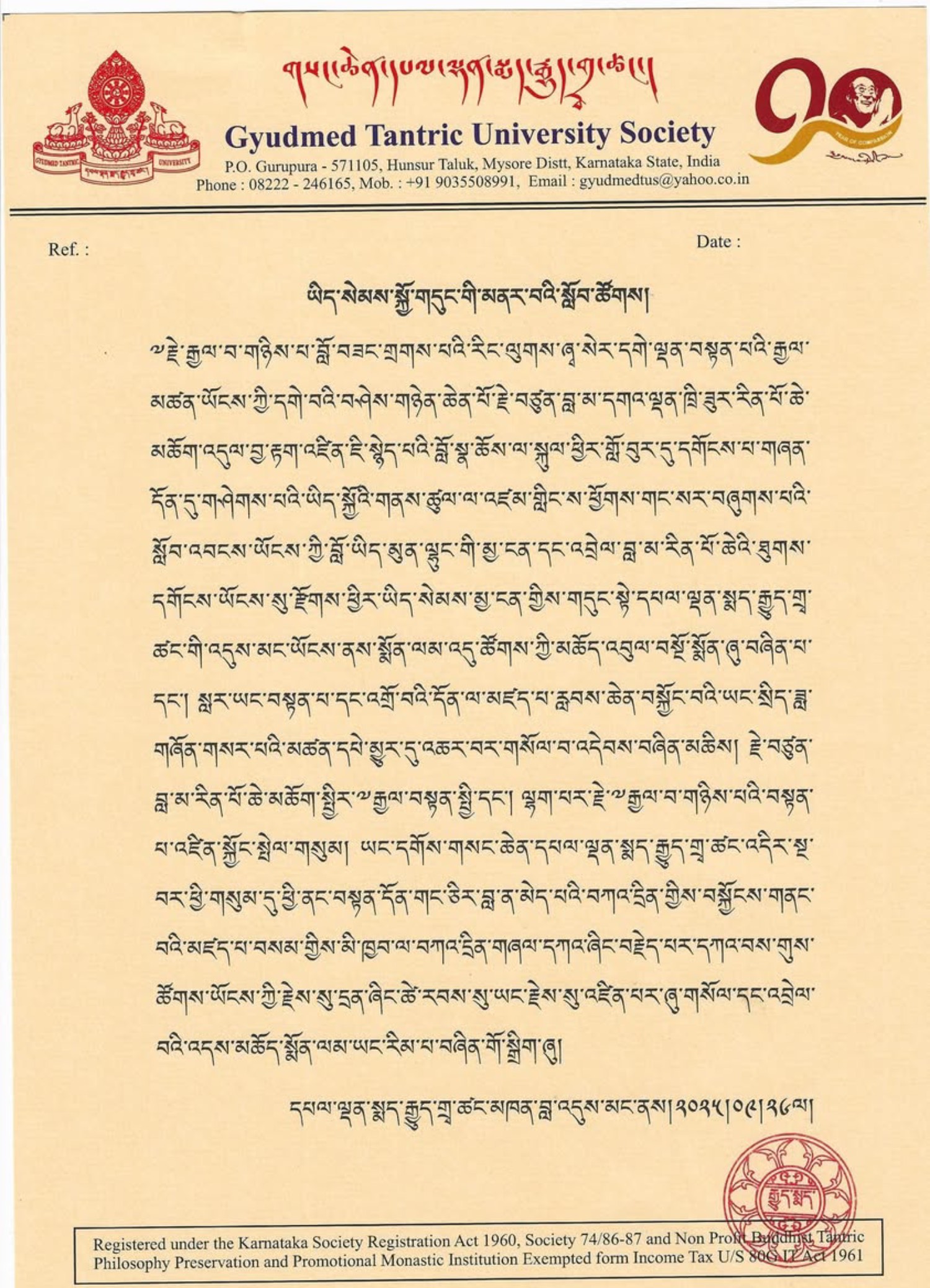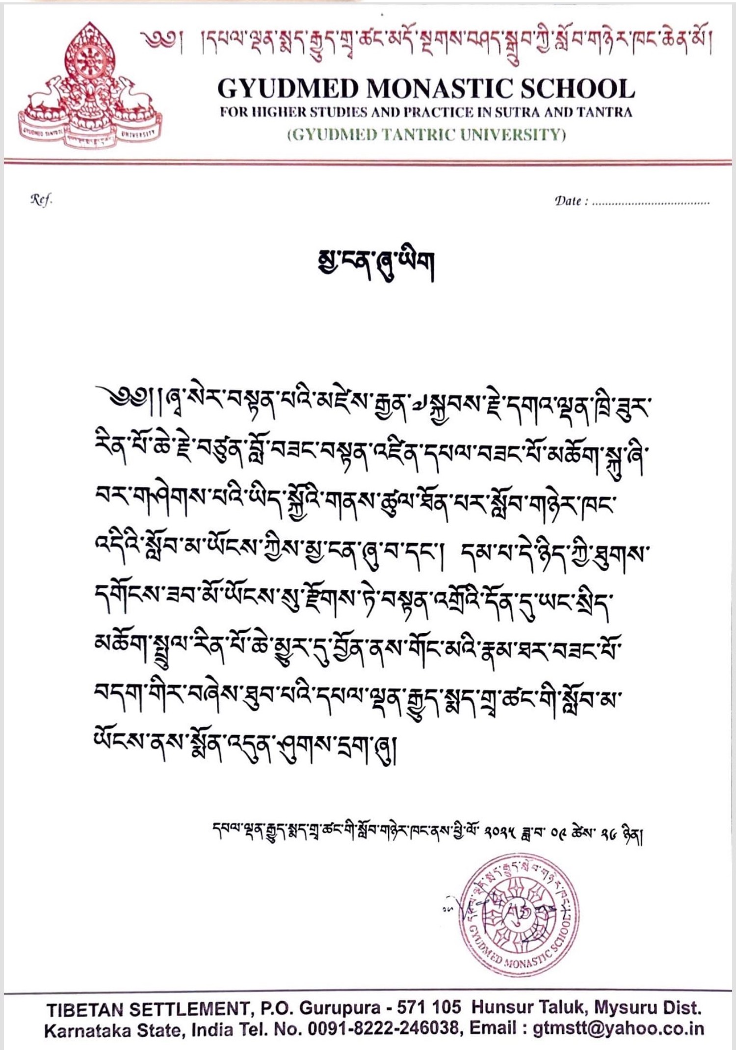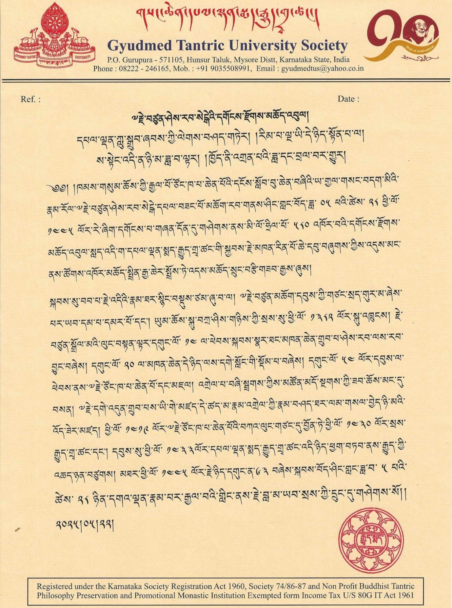 ༄༅། །གསང་ཆེན་རྡོ་རྗེ་ཐེག་པའི་བཤད་སྒྲུབ་ཀྱི་བསྟི་གནས་ཆེན་པོ་འདིར་རིག་པ་འཛིན་པའི་དགེ་འདུན་འདུ་བ་དང་གནས་ཤིང་བསླབ་གསུམ་ཐུགས་ལ་གཞོལ་བའི་ཆ་རྐྱེན་དགོས་མཁོར་དམིགས། སྐབས་འདིའི་གྲྭ་ཚང་གི་སྤྱི་འགན་ལས་ཐོག་པ་རྣམས་ནས་འདུས་མང་གི་བཞུགས་གནས་ཀུན་དགའ་ར་བ་ཐོག་བརྩེགས་ཅན་ཞིག་གསར་དུ་བསྐྲུན་པའི་ལས་འཆར་འདི་ཡང་གྲྭ་ཚང་འདི་ཉིད་ལ་དད་འདུན་ཅན་ཕྱི་ནང་འབྲེལ་ཡོད་རྣམ་པའི་མཐུན་སྦྱོར་དང། སྤྱི་འགན་ཁང་ནས་ཀྱང་སྐུ་ངལ་འབད་ཐབས་གནང་བའི་འོག་ཨར་ལས་འཛུགས་བསྐྲུན་གྱི་ལས་འགོ་འཛུགས་ཐུབ་པ་དང། དང་པོའི་ས་བཅག་རྡོ་འདུལ་གྱི་ཆོ་གའི་རིམ་པ་བརྒྱུད་ལས་དོན་ལམ་ལྷོང་ཡོང་པའི་སྨོན་ཆོག་བཅས་ཀྱི་ལས་ཡུལ་དངོས་སུ་གནང་བའོ། །རྒྱུད་སྨད་དཔེ་མཛོད་ཁང་དྲ་ངོས་རྩོམ་སྒྲིག་པས་ ༢༠༢༥།༠༩།༢༣ལ།