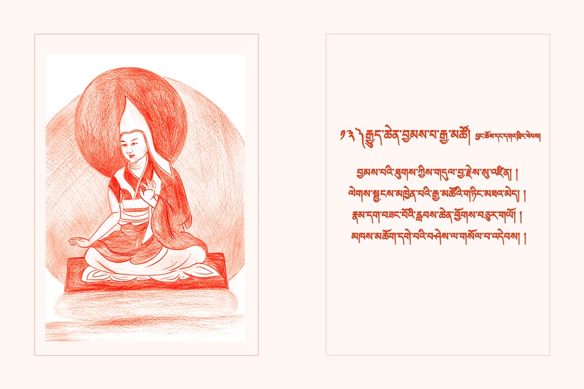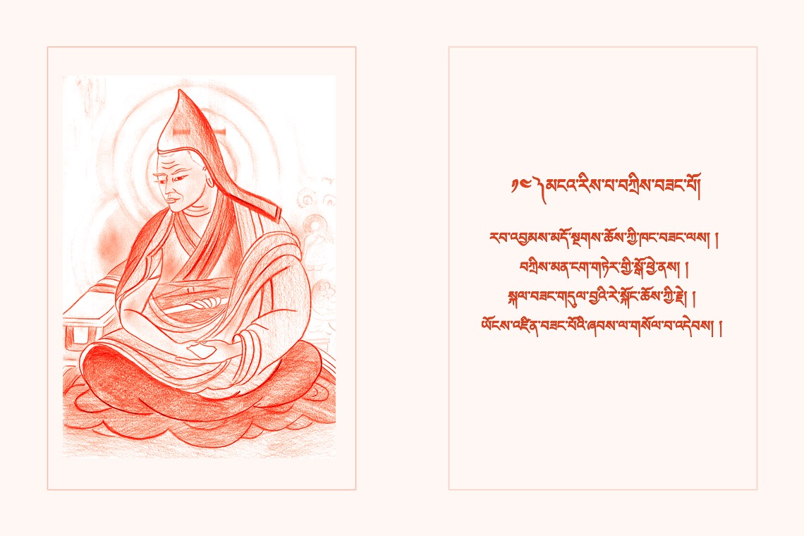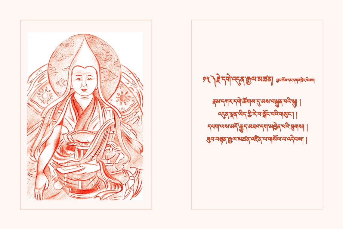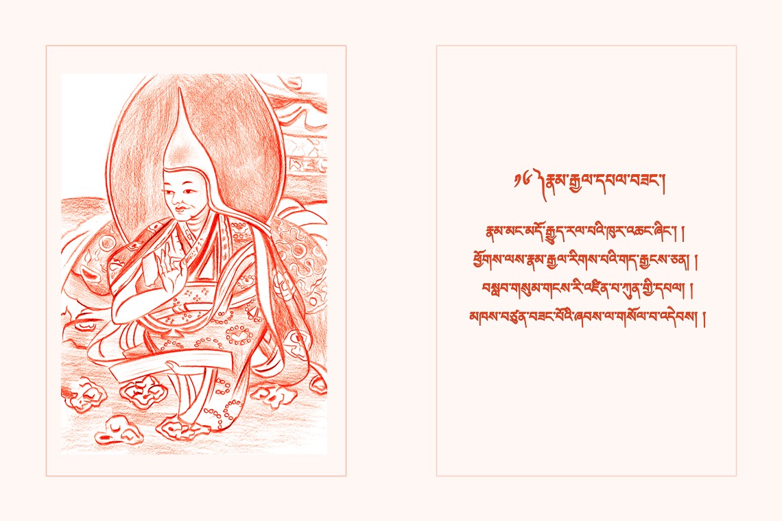 བྱམས་པའི་ཐུགས་ཀྱིས་གདུལ་བྱ་རྗེས་སུ་འཛིན། །ལེགས་སྦྱངས་མཁྱེན་པའི་རྒྱ་མཚོའི་གཏིང་མཐའ་མེད། །
