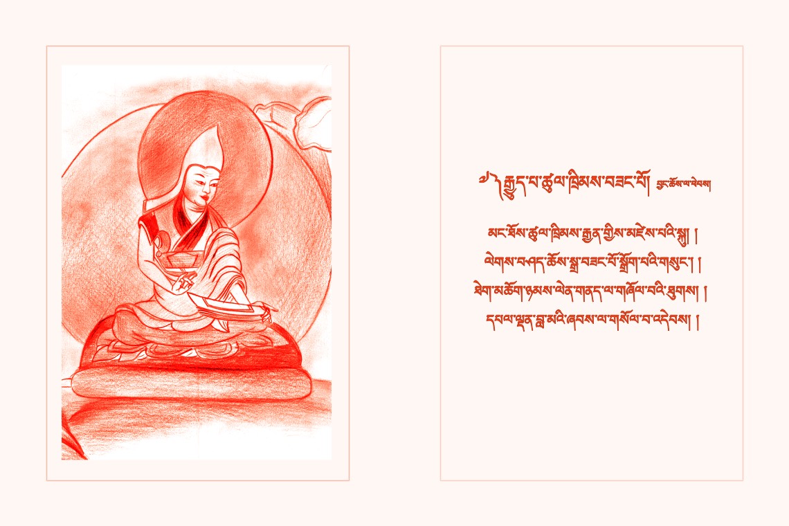མཁས་མང་སྐྱེ་དགུའི་དབུས་ན་མངོན་མཐོ་བ། །མི་ཕམ་བླ་མའི་ཞབས་ལ་གསོལ་བ་འདེབས། །