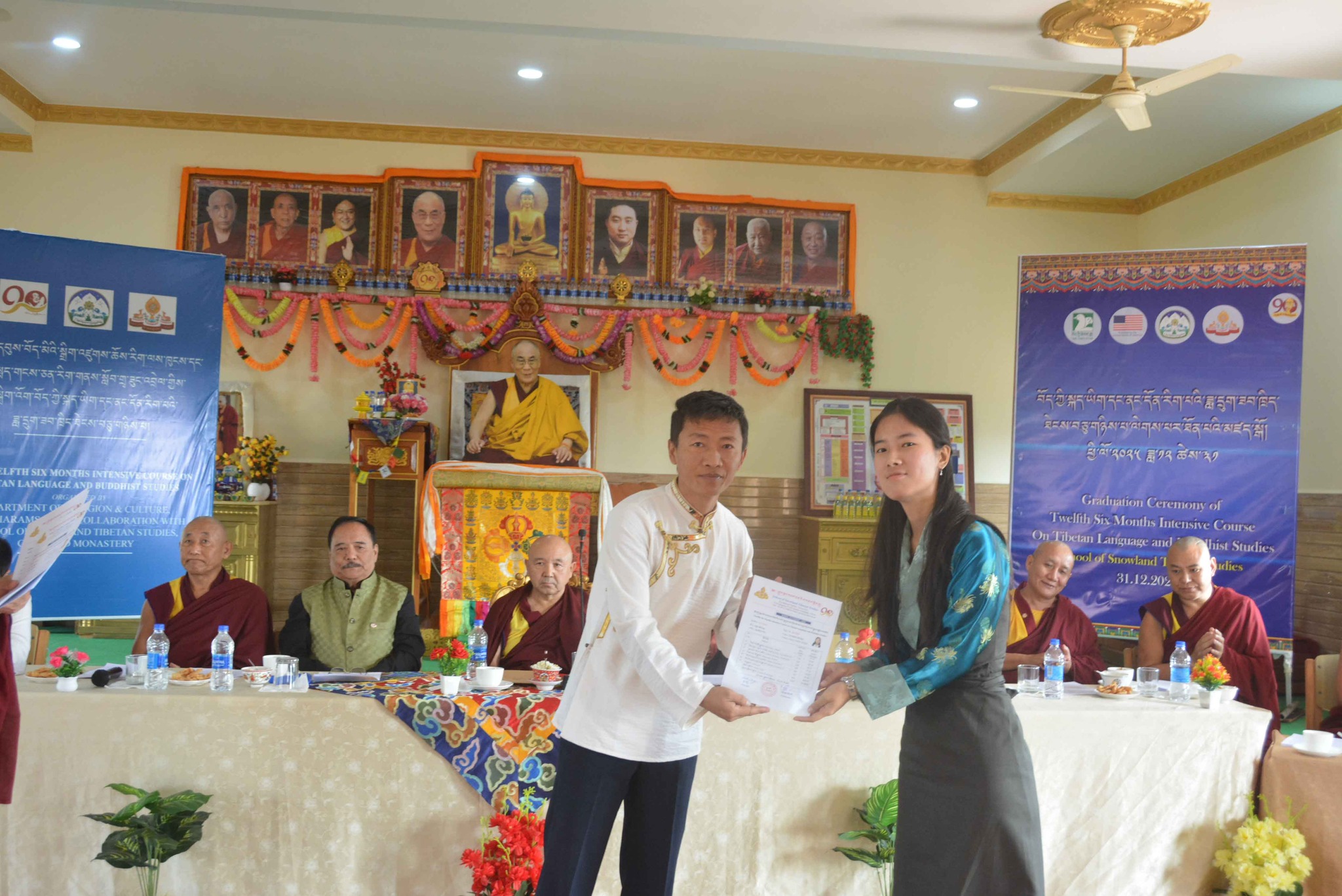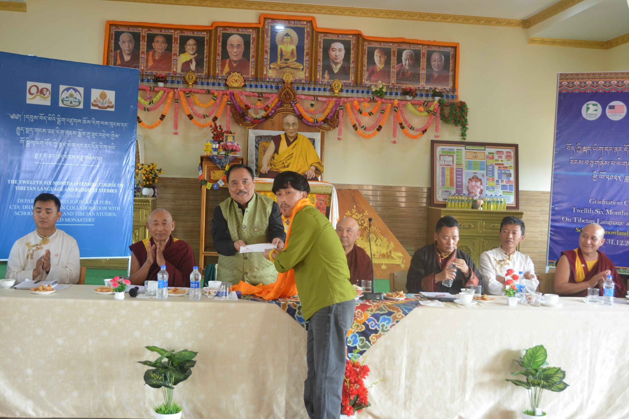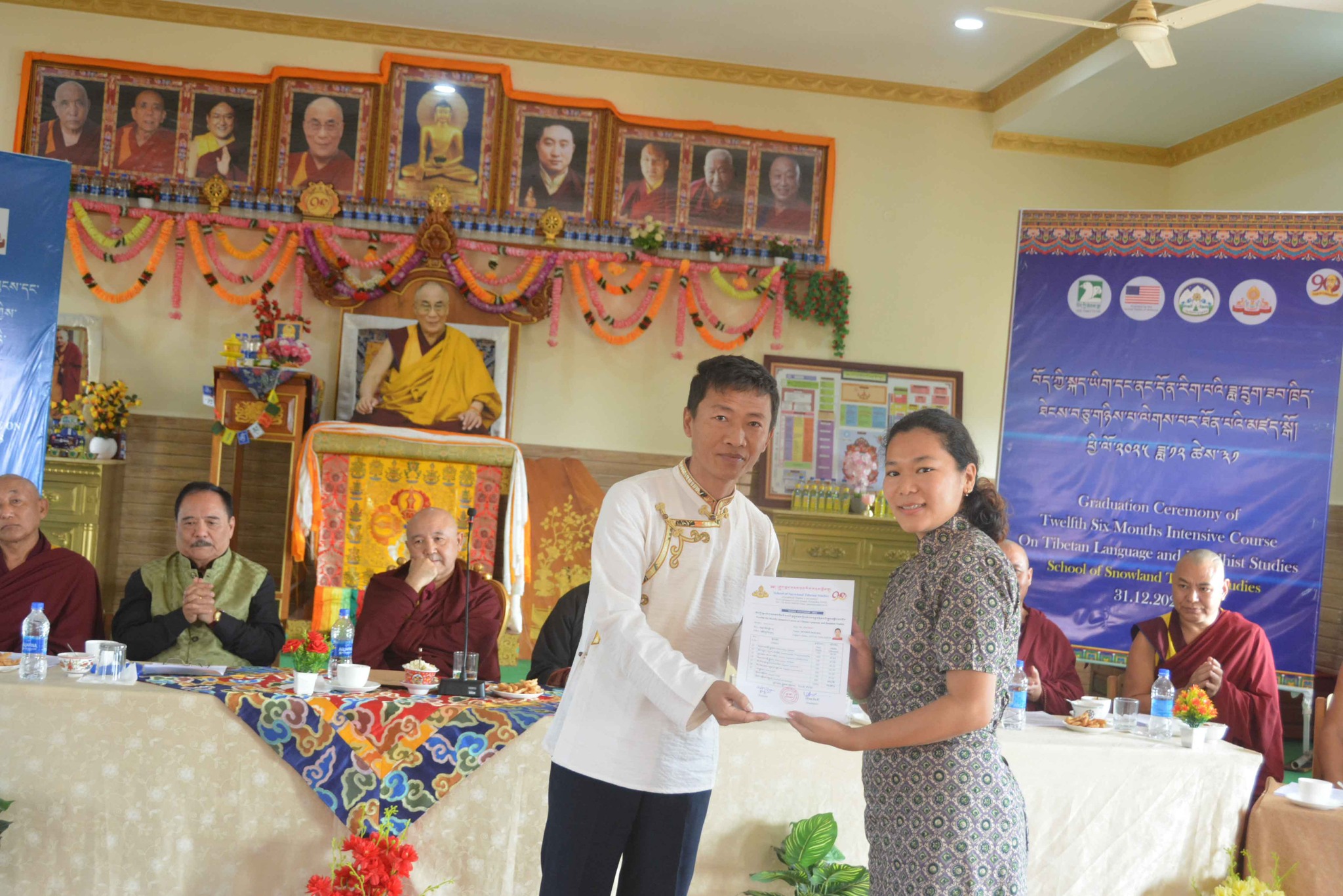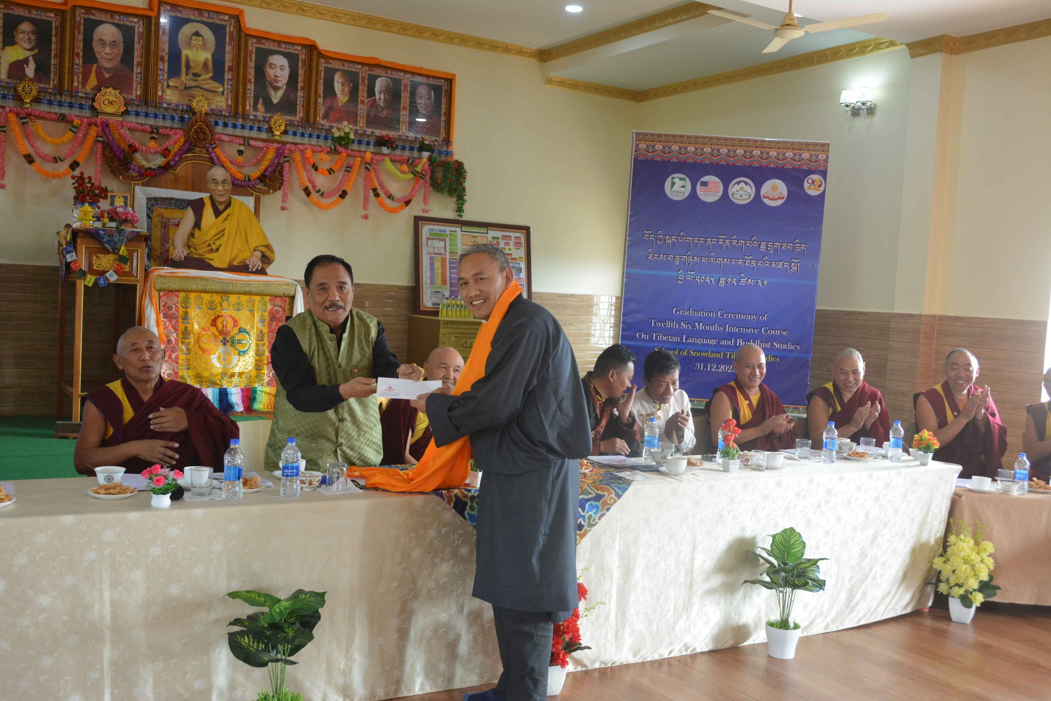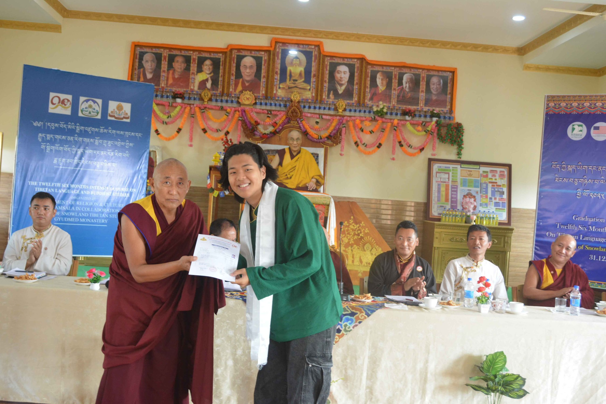 སྐུ་མགྲོན་གཙོ་བོ་མཆོག་ནས་རྒྱུགས་སྤྲོད་རྩེ་ཕུད་གསུམ་དང་། དེ་བཞིན་བོད་མི་མང་སྤྱི་འཐུས་མི་འགྱུར་རྡོ་རྗེ་ལགས་ནས་ཉེ་བའི་རྩེ་ཕུད་གསུམ་ལ་བྱ་དགའ་གནང་ཡོད། དེ་ནས་རིམ་པས་ཆོས་རིག་དྲུང་ཆེ་ནས་ཟབ་ཁྲིད་མཐར་སོན་གྱི་ཕྱག་འཁྱེར་དང་། ཧོན་སུར་ས་གནས་འགོ་འཛིན་ནས་ཡིག་རྒྱུགས་གྲུབ་འབྲས་ཀྱི་ཨང་ཤོག་གནང་རྗེས་ཆོས་རིག་དྲུང་ཆེ་ནས་ཆོས་རིག་ལས་ཁུངས་ངོས་ནས་རྒྱུད་སྨད་གངས་ཅན་རིག་གནས་སློབ་གྲྭའི་དགེ་ལས་རྣམ་པར་ཐུགས་རྗེ་ལེགས་གསོལ་གྱི་ཕྱག་རྟགས་ཕུལ་ཡོད། དེ་ནས་དཔལ་ལྡན་སྨད་རྒྱུད་གྲྭ་ཚང་གི་སློབ་སྤྱི་དགེ་བཤེས་སྔགས་རམས་པ་རྒན་བསོད་ནམས་དངོས་གྲུབ་ལགས་ཀྱིས་སློབ་ཕྲུག་ཡོངས་ལ་སྟོང་མིན་ཙམ་གྱི་ཕྱག་རྟགས་རེ་དང་། སློབ་ཕྲུག་བུའི་རྒན་བདག་ཟླ་བ་བསྟན་འཛིན་ལགས་དང་། བུ་མོའི་རྒན་བདག་བསྟན་འཛིན་སྒྲོལ་མ་གཉིས་ལ་ཐུགས་རྗེ་ལེགས་གསོལ་གནང་།