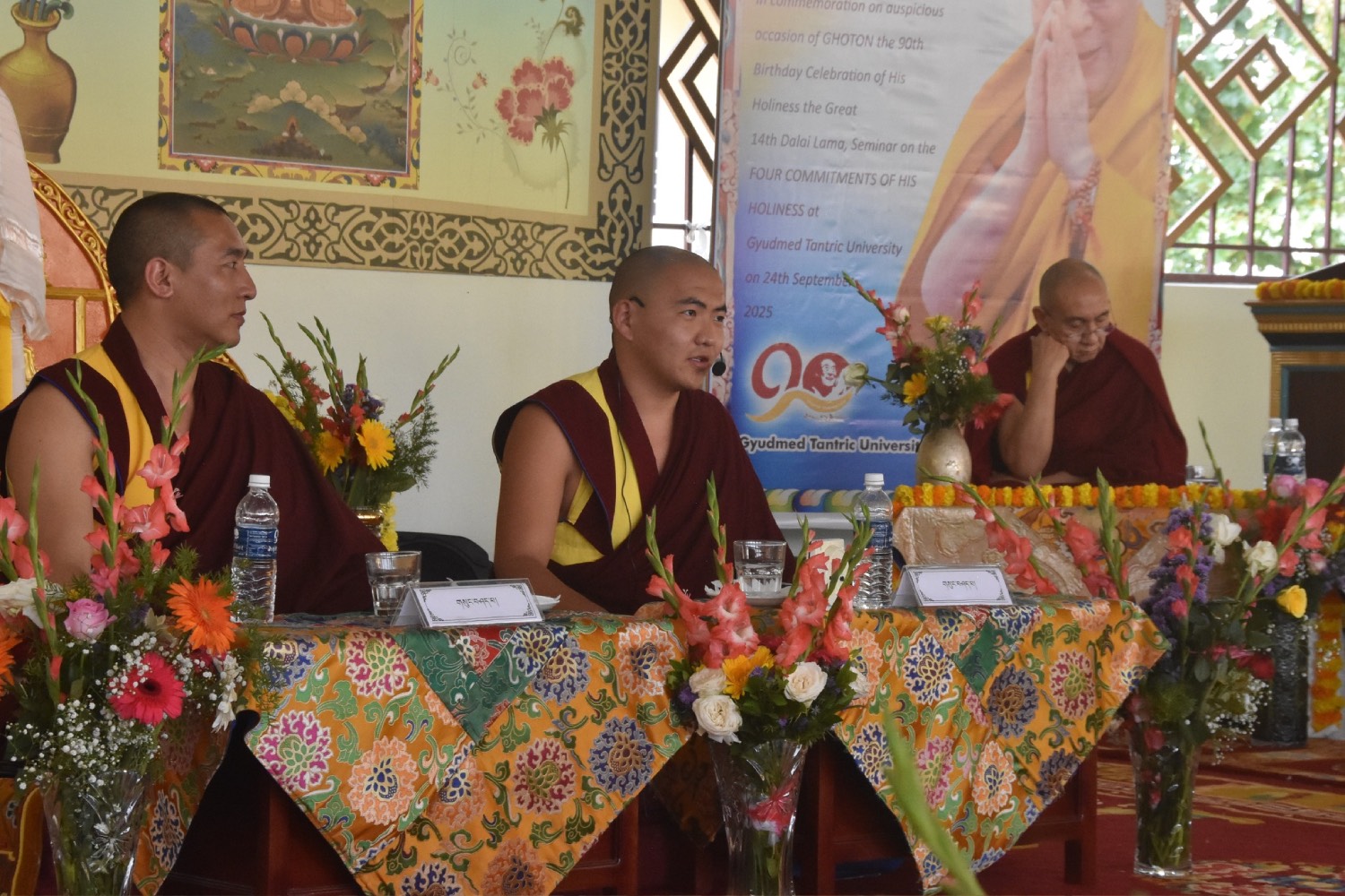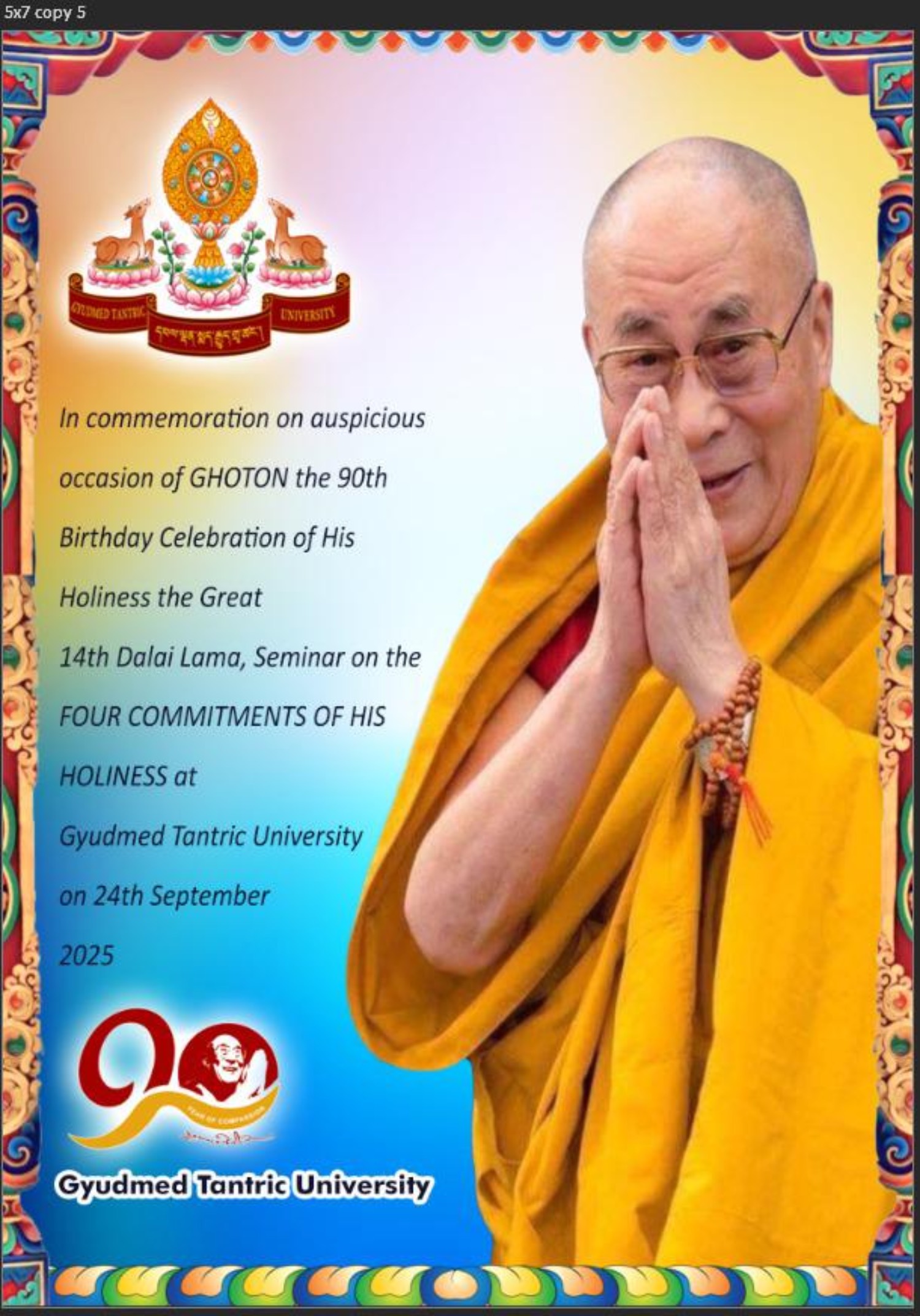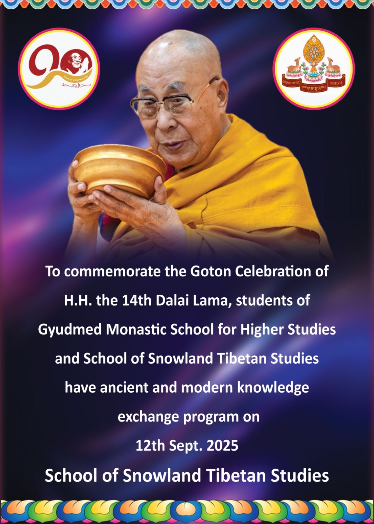 ༄༅། །སྤྱི་ལོ་ ༢༠༢༥ ལོ་ངོ་ཧྲིལ་པོ་བྱམས་བརྩེའི་ལོ་ཞེས་ ༧ གོང་ས་ ༧ སྐྱབས་མགོན་ཆེན་པོ་མཆོག་དགུང་གྲངས་ ༩༠ ལ་ཕེབས་པའི་གོ་སྟོན་གྱི་སྲུང་བརྩི་ལོ་འཁོར་མོར་ཞུ་ཞིང་། འཛམ་གླིང་ཡུལ་གྲུ་ཀུན་ནས་རང་རང་གི་བརྩམས་ཆོས་རྣམ་གྲངས་དུ་མས་གོ་སྟོན་སྲུང་བརྩི་ཞུ་བཞིན་ཡོད། ད་རེས་དཔལ་ལྡན་སྨད་རྒྱུད་གྲྭ་ཚང་གི་མཁན་བླ་དགེ་སློབ་འདུས་མང་དང་བཅས་ནས་༧རྒྱལ་བའི་གོ་སྟོན་སྲུང་བརྩིའི་ལས་རིམ་ཐེངས་མ་གསུམ་པར་༧རྒྱལ་བའི་ཐུགས་བསྐྱེད་ཀྱི་དམ་བཅའ་ཆེན་པོ་བཞི་ཡི་ཟབ་བརླིང་གོ་དོན་གསལ་བྱེད་ཀྱི་བགྲོ་གླེང་ཆེན་པོ་ཞིག་གནང་བར་མང་ཐོས་དགེ་བའི་བཤེས་གཉེན་རྣམས་དང་བློ་གསར་རིག་པའི་རྩལ་ཅན་དུ་མས་གོ་སྐབས་དགའ་སྤྲོས་བཞེས་པའོ། །རྒྱུད་སྨད་དཔེ་མཛོད་ཁང་དྲ་ངོས་རྩོམ་སྒྲིག་པས་ ༢༠༢༥།༠༩།༢༤ ལ།